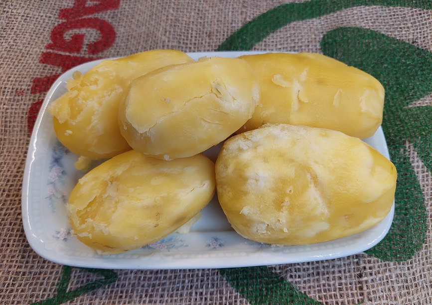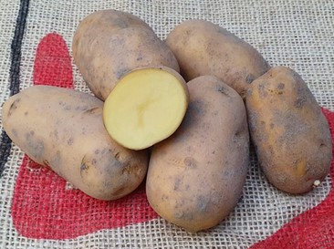 De Agria is speciaal voor de fritesproductie ontwikkeld met een lang ovale vorm, waar je mooie frites uit kunt snijden. De vleeskleur van de Agria is uitgesproken geel. Het is een redelijk vastkokende aardappel zeker de eerste tijd na de oogst maar naar mate de winter verstrijkt en het voorjaar zich aandient wordt hij wat meliger en losser in de kook. De Agria is zeer goed bewaarbaar en heeft een mooie zachte smaak en is daarom een prima tafel aardappel. Gebakken is het ook een mooie en smakelijke aardappel en in stampotten en puree is hij goed te gebruiken. Agria is een middellate aardappel en is redelijk goed resistent tegen de meeste aardappelziektes. |