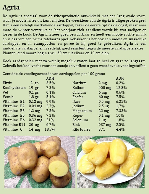 Bij levering van het pootgoed ontvangt u bij elk ras een informatiesheet, zoals hierboven is afgebeeld van het ras Agria.