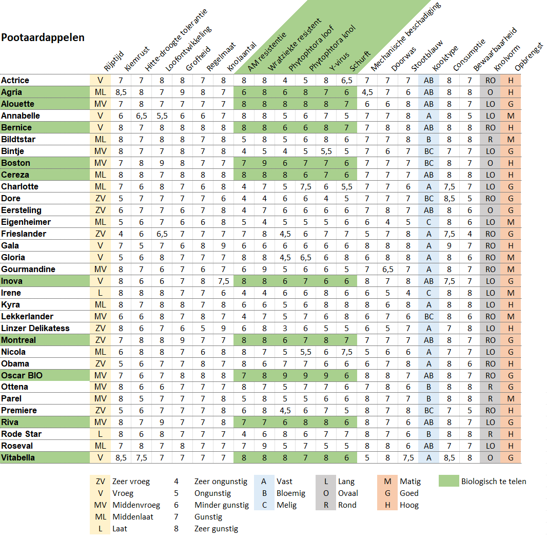 | Biologische teelt In de biologische aardappelteelt wordt niet gespoten. Het gevolg is wel dat het groeiseizoen direct voorbij is zodra het perceel op grotere schaal is besmet met phytophthora. Kleine besmettingen kunnen nog worden ingedamd door de planten plaatselijk dood te branden. Vóór de oogst worden op het gehele perceel de planten doodgebrand. Door vroegtijdige besmetting daalt de oogstopbrengst bij de biologische teelt aanzienlijk en door het grillige verloop treden er van jaar tot jaar ook grote verschillen op. Doordat biologische producten veelal rechtstreeks aan de consument worden verkocht, is de teelt ervan vaak toch lonend. Soorten die in het overzichtlijstje groen zijn gemerkt zoals Alouette, Montreal, Riva, Boston en Vitabella zijn goed geschikt om biologisch te telen. |